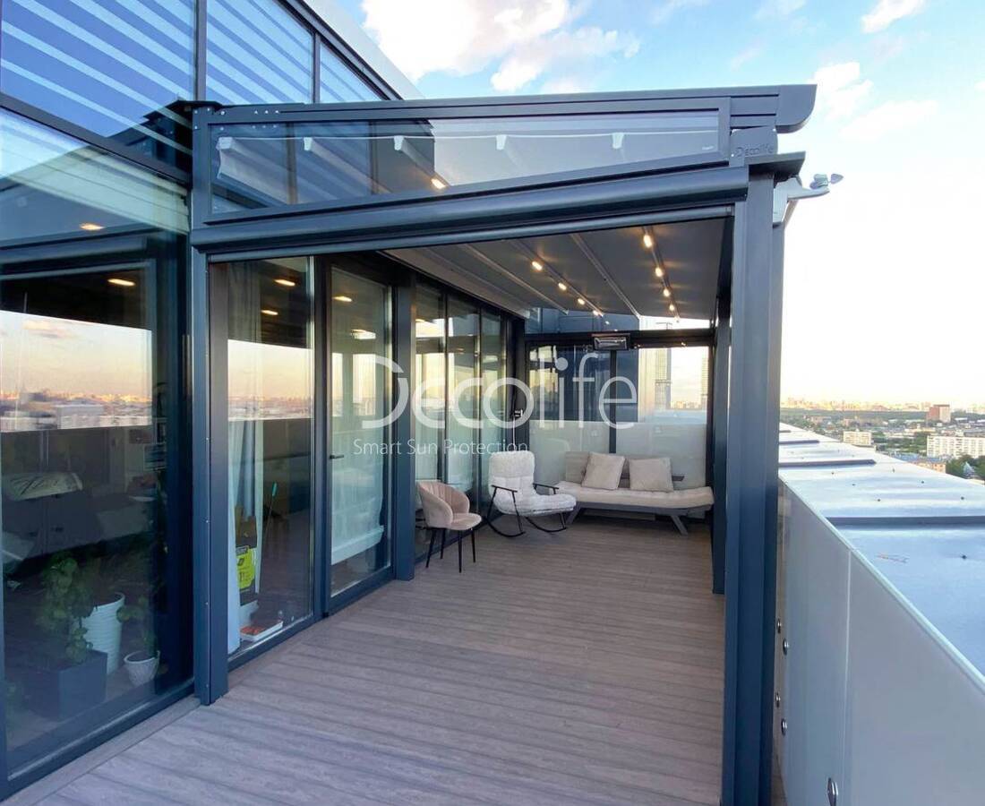 Пергола биоклиматическая Decolife В700-20C + Раздвижное остекление S500 + Вертикальная система Zip 100 - г. Истра